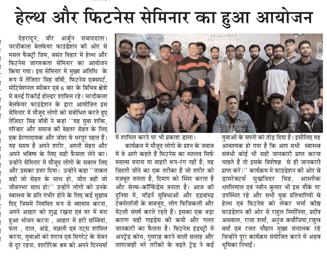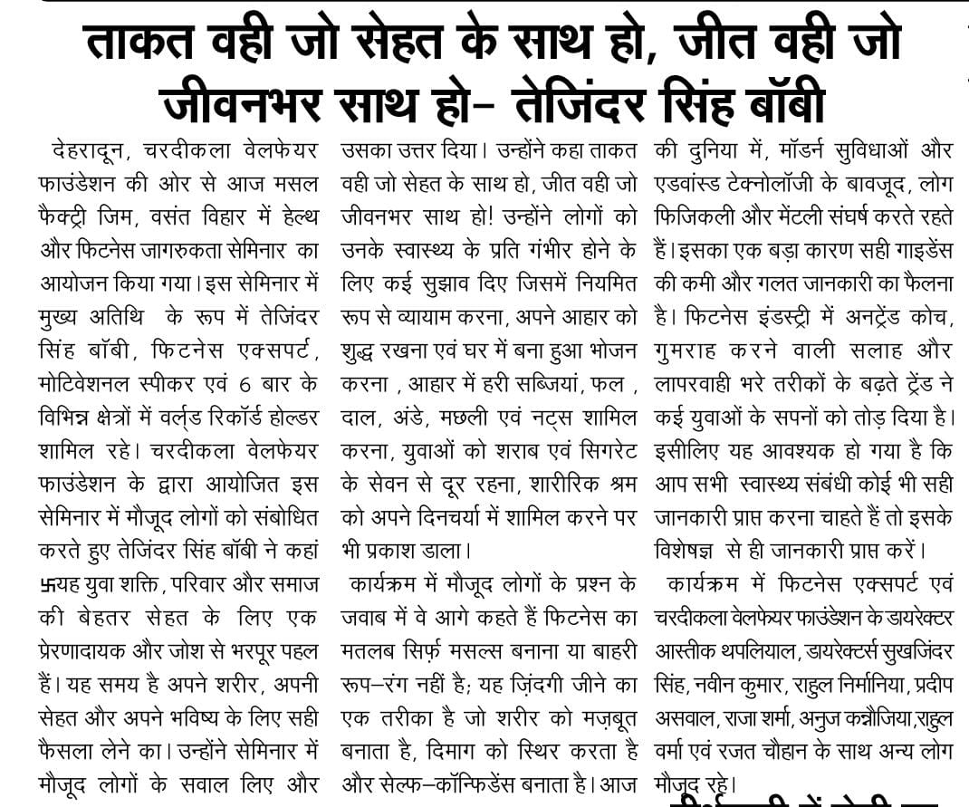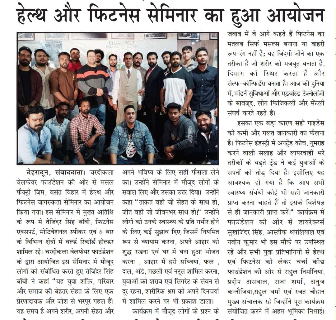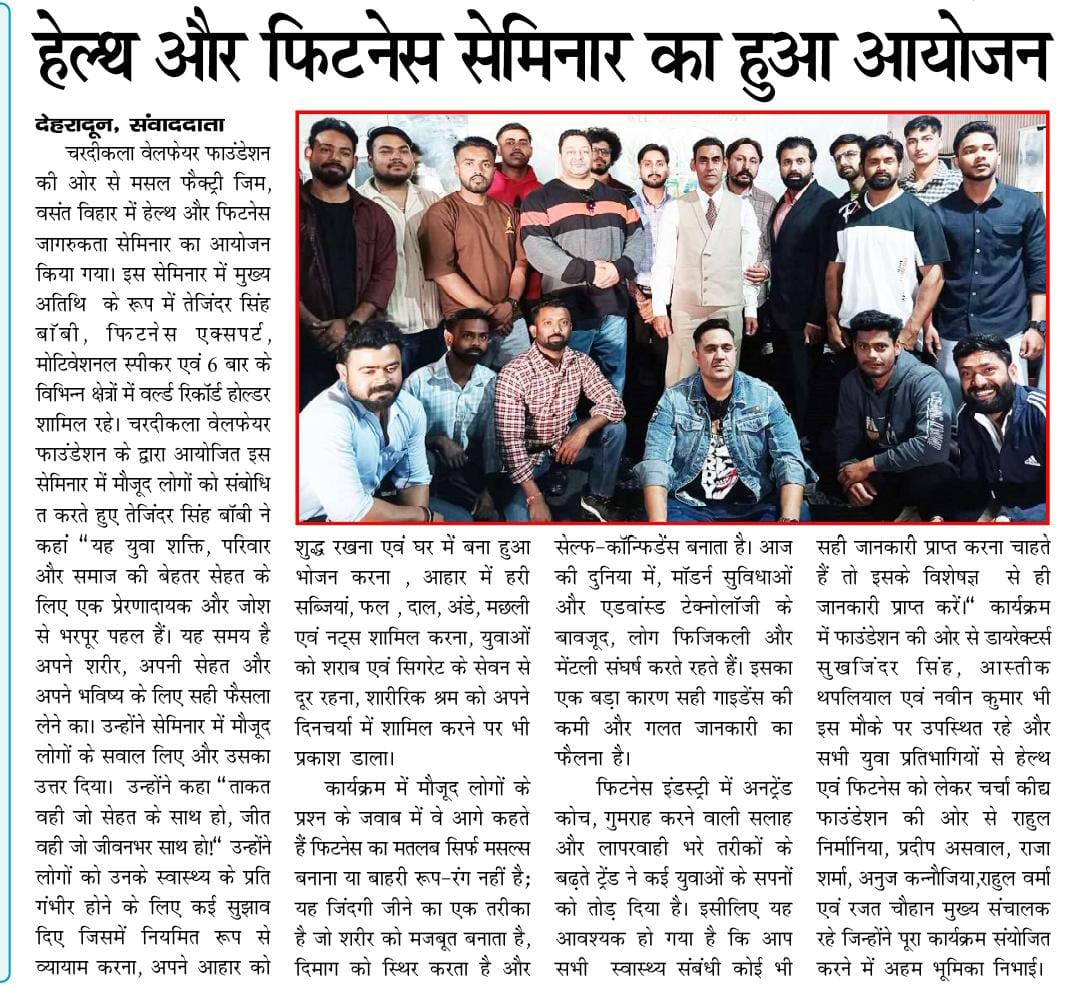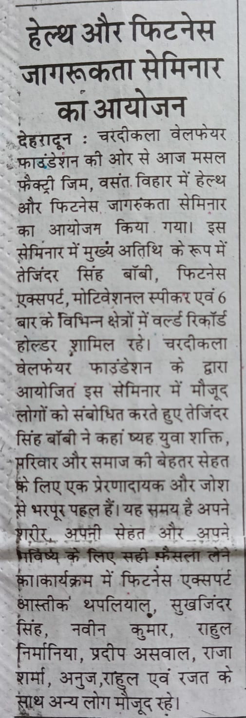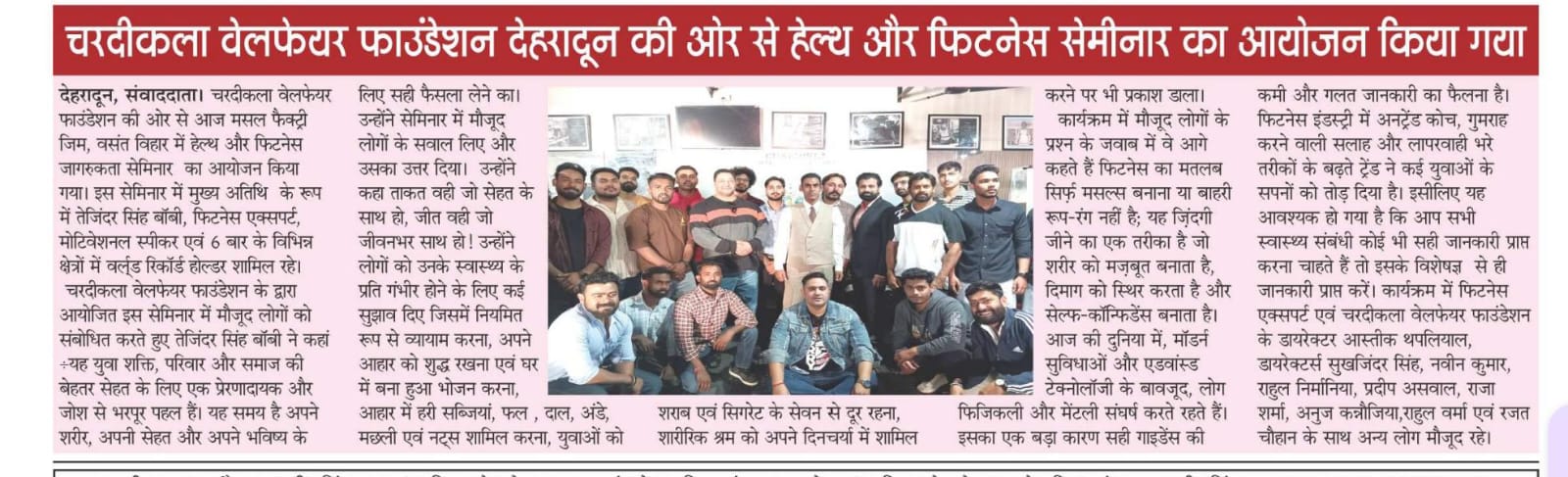 ताकत वही जो सेहत के साथ हो, जीत वही जो जीवनभर साथ हो :बॉबी -: चरदीकला वेलफेयर फाउंडेशन देहरादून की ओर से हेल्थ और फिटनेस सेमीनार का किया गया आयोजन
